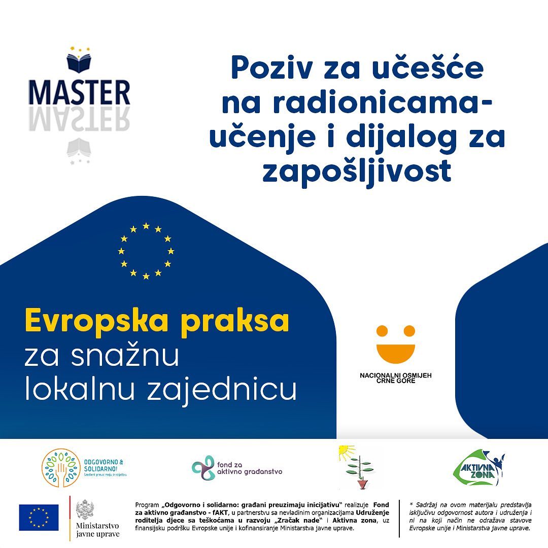 Projekat @master.evropskepolitike je podržan kroz program “Odgovorno i solidarno: građani preuzimaju inicijativu”, koji realizuje @faktcg u partnerstvu sa nevladinim organizacijama Udruženje djece sa teškoćama u razvoju “Zračak nade” i @aktivna.zona, uz finansijsku podršku @evropska_kuca i kofinansiranje @min_javneuprave_cg .